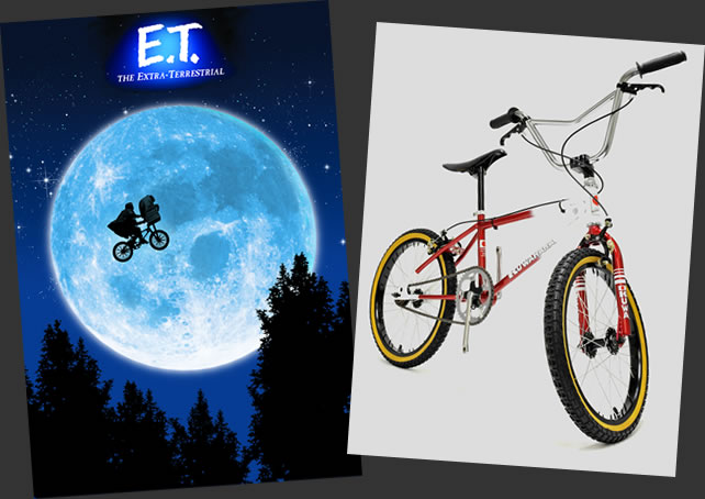 「E.T.」に登場したBMXは、大阪の老舗自転車メーカー、クワハラが手がけたもの。映画が公開された当時、アメリカではBMXが大ブームで、一流選手を多く起用して現地でレーシングチームを結成していたクワハラは子供たちにとって憧れのブランドでした。映画製作時にスピルバーグ監督がアメリカの子供たちに「乗ってみたいBMXは?」と聞いたところ「クワハラ」と答えが多かったため、採用が決まったそうです。