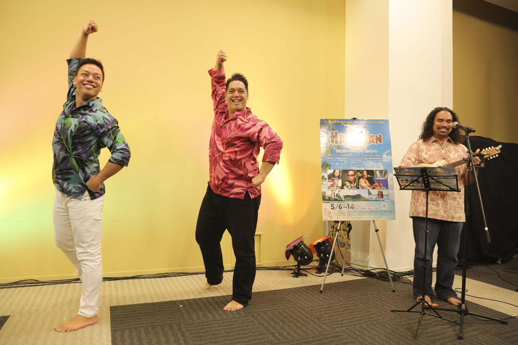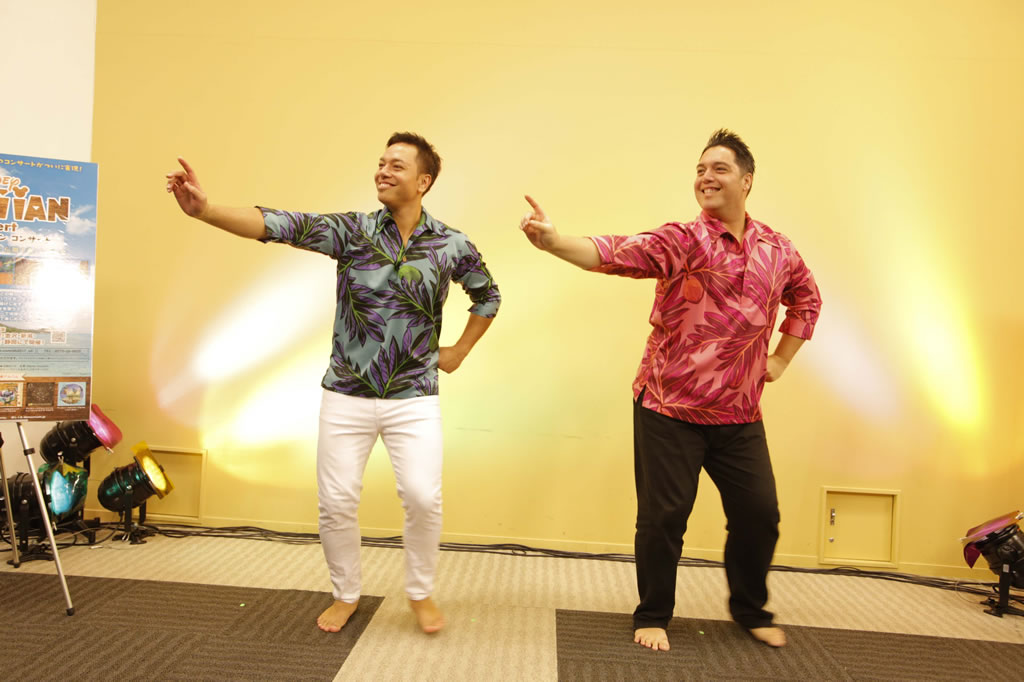 アーロン・サラの歌とウクレレ演奏による名曲「アンダー・ザ・シー」に合わせてキナ&カラニが踊る男性フラダンスのパフォーマンスが披露され、会場は一気にハワイアンムードに包まれた。