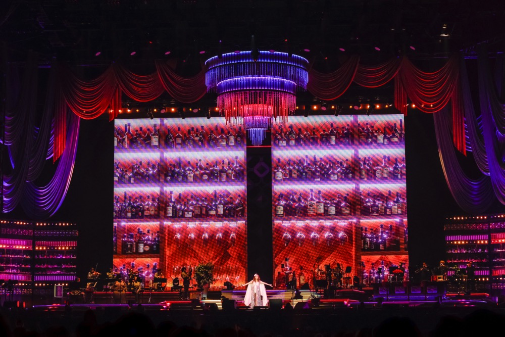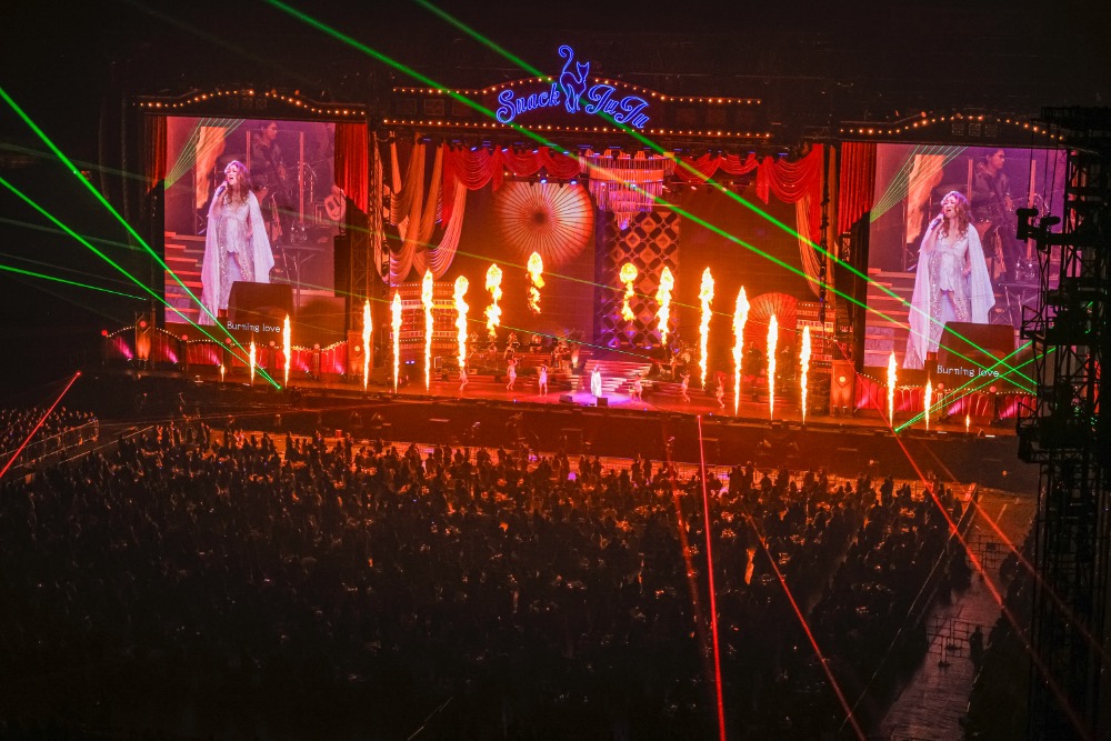 東京ドーム店ならではのトロッコ移動で、お客さんのお悩みに答えながらセンターステージへたどり着いた後は、「なごり雪」、「いとしのエリー」へ。昭和を代表する名バラード2曲を、ギター・コーラス・ヴィオラ・チェロというアコースティック編成で、ママと流しのミュージシャンが、丁寧に歌い届ける。 「伊勢佐木町ブルース」では、大人の世界へ誘われるようなサックスの音色が心を躍らせ、おなじみの“あの声”もドームにこだまする。 続く「どうにもとまらない」はパワフルなヴォーカルが体を高揚させるが、「スナックJUJU」の店舗拡大を続けるママ自身の事のようにも聞こえてくる。 バラードはしっとりと心の奥に届き、色気溢れる曲では妖艶に響く歌声は、ママのシンガーとしての幅広さ、表現力をも感じさせた。