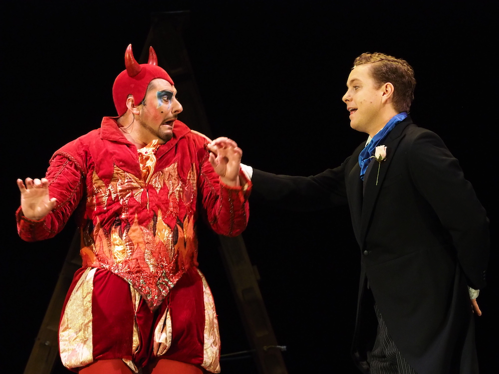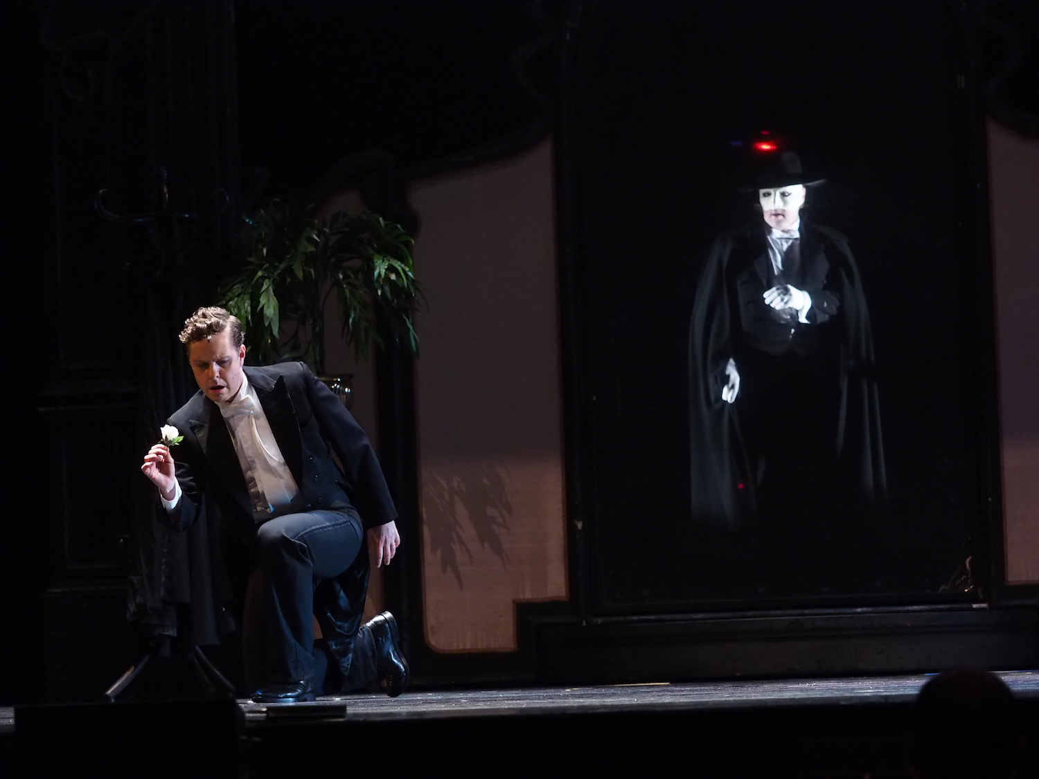 すると、客席通路から男性たちが現れた。新しくオペラ座に着任した支配人リシャードたちだ。彼らは客席や通路、天井などをワイワイしながらチェック。頭上のシャンデリアが危なっかしい、落ちたらこの辺りの観客が大変!と、実際の観客をいじり出した。観客の私たちは、ここで悟る。今、私たちが座っているこの劇場はパリ・オペラ座なのだと!この仕掛けにワクワクして、一気に自分がオペラ座の人間として参加している気分になった。こうして、劇場全体を使い、観客を巻き込みながら話が進む。
