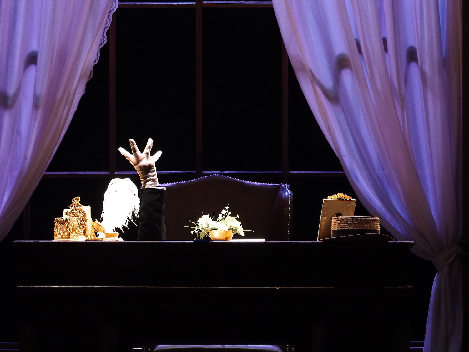 まず客席前方の頭上に飾られた、大きなシャンデリアに目を奪われた。シャンデリアと言えば、この作品の象徴。物語は不穏な音から始まり、踊り子が幽霊の存在を匂わせる。