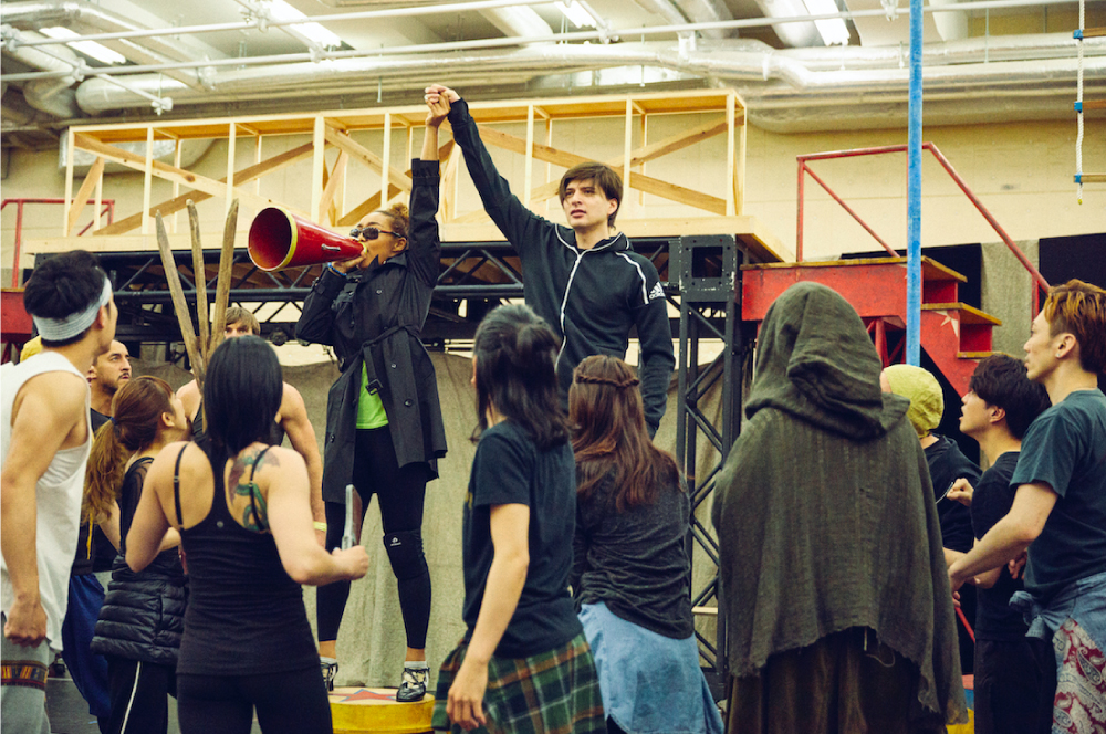 『ピピン』は、若き王子・ピピンが人生の目的を求め、「特別な何か(=Extraordinary)」を探す人生の旅をユーモラスに描いた作品だ。リーディングプレイヤーは、ピピンを導き、その物語を観客に伝える役割を担う。 この日行われていたのは、自我に目覚めたピピンが戦争に空しさを感じ、父である王・チャールズ(今井清隆)を倒そうと反乱をおこそうと民衆を奮い立たせる場面だ。「日本語は赤ちゃんレベル(笑)」というパウルスだが、日本語のセリフをスタッフに確認し、そのシーンやセリフの意味するところを丁寧に伝えていた。「ニュースで見るような暴徒をイメージして」と、時には立ち上がり、出演者たちの円に加わって指導。「チャールズ倒せ!」という出演者たちの声は、次第に熱を帯びていった。