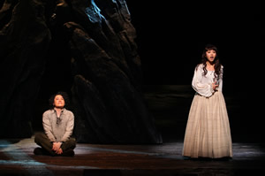 名作古典『嵐が丘』を多彩なスタッフでミュージカル化した本作。 河村隆一、平野綾、安倍なつみ、山崎育三郎と魅力的なキャスティングで、 激しい愛とその裏返しである、より激しい憎しみを痛々しいほど純粋に描き出している。 囲み取材では、 「この舞台では一人一人が、自分の信じた愛のために、傷ついたり、悩んだり、悔やんだり、色んなことを経験していきますが、 今、そこまで一人のことを愛せるのか、と考えました。 愛が希薄になった現代だからこそ、見てもらいたい作品です。」 (河村隆一) 「倉本裕基さんの手がけた楽曲がこの「嵐が丘」の世界観をさらに広げているところに注目して欲しい」 (山崎育三郎) 「今までに経験したことのないくらいの、豪華な衣装は必見です!」(安倍なつみ) と、それぞれ見どころを語った。 今回が舞台初挑戦となる平野 綾は 「声のみのお芝居とは全く違い失敗も多いのですが、本当に温かい現場で、みなさんに指導して頂いています。」 と、舞台裏も明かした。 また、今回キャサリンをWキャストで安倍なつみ、平野 綾が演じることについて河村は、 「2人が演じるキャサリンのテイストが違うので、それを受けてどんどん演技も変化していくのを楽しんでいる。 二度と言わず、三度、四度と楽しんで頂ける作品だと思います。」 と、堂々と語った。 ミュージカル「嵐が丘」は7月24日まで赤坂ACTシアターで上演中。 大阪公演は、7月27日~31日、梅田芸術劇場シアター・ドラマシティにて。 チケットの予約・問い合わせは キョードー東京 0570-550-799 チケットのご購入はこちら |